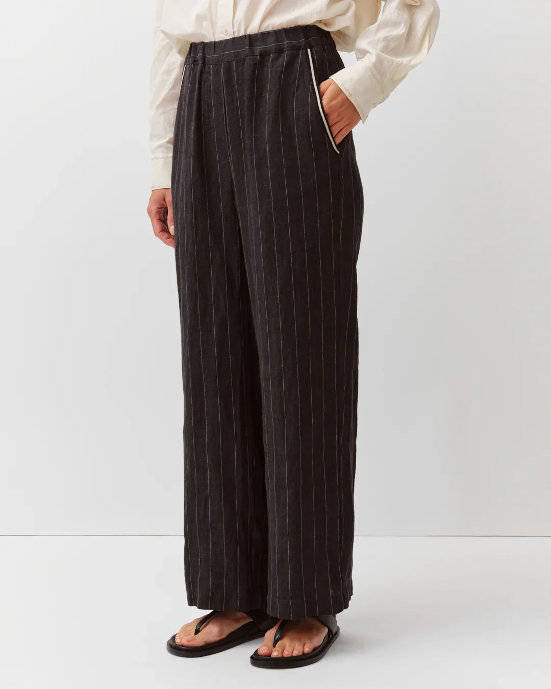 Straight-leg trousers with a loose fit. Features an elastic waistband at the back for added comfort and a flat waistband at the front. Includes two side slash pockets and a faux fly. Ankle length.
