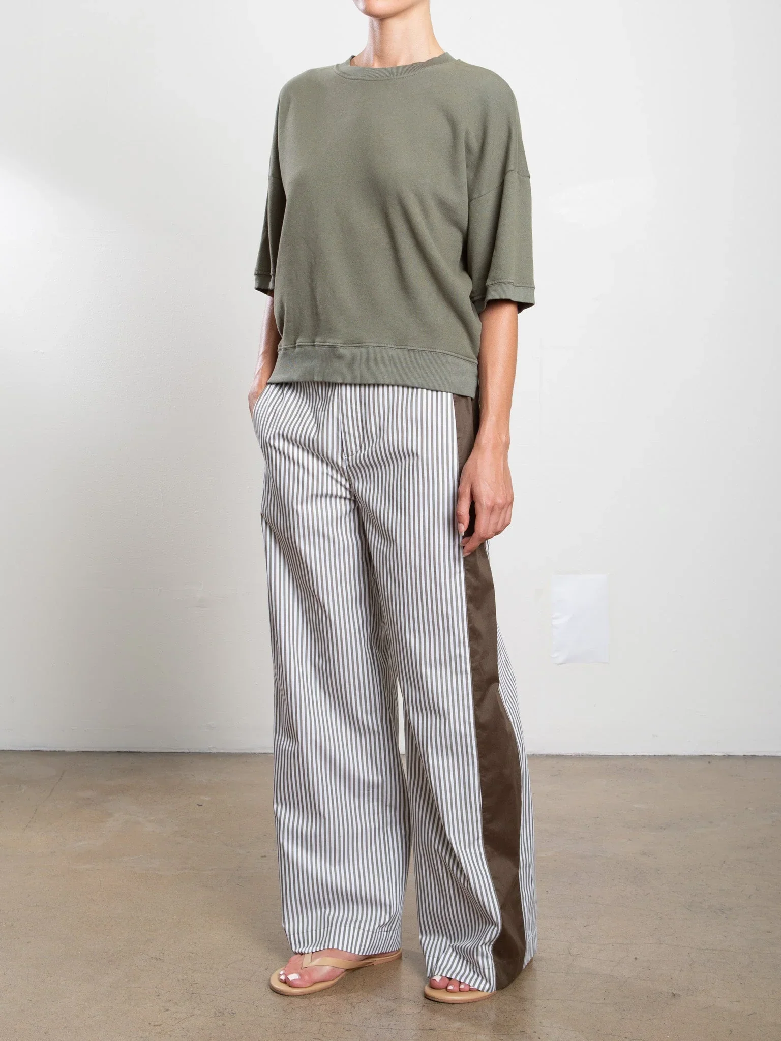 Wide-leg trouser in striped cotton poplin with solid side panel. Has a clean front waistband and elastic in back for ease of wear.